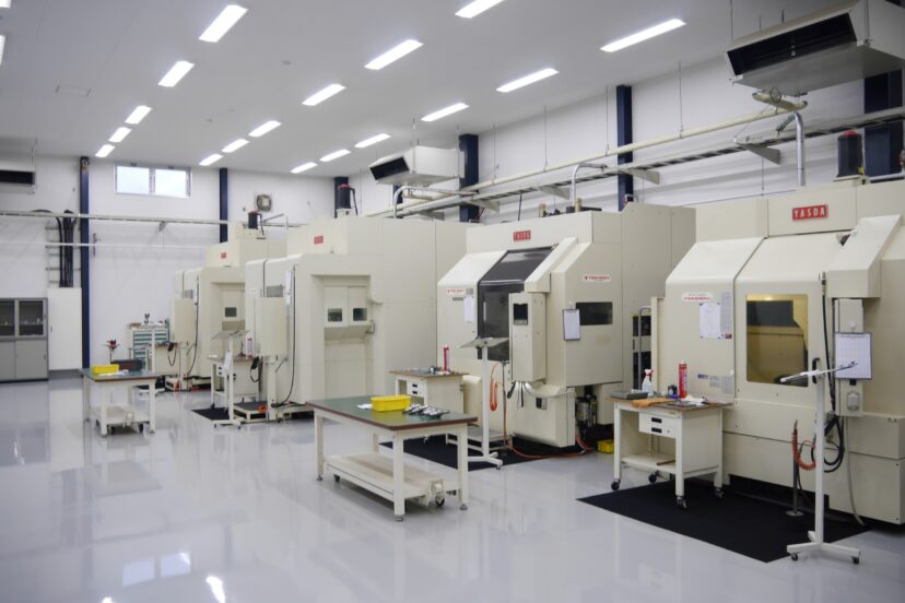 マシニング部門には、5軸加工機がズラリと並び、CAD/CAM作成のNCプログラムにより高精度・高効率加工を実現。炭素鋼、アルミ鋼、耐熱合金鋼、磁気遮蔽材料、樹脂等の難削材加工に対応している。