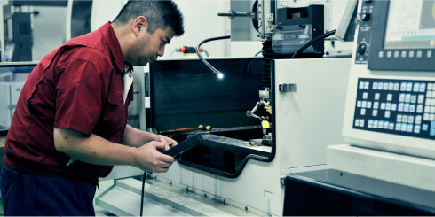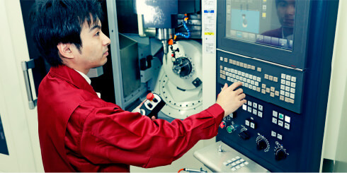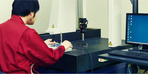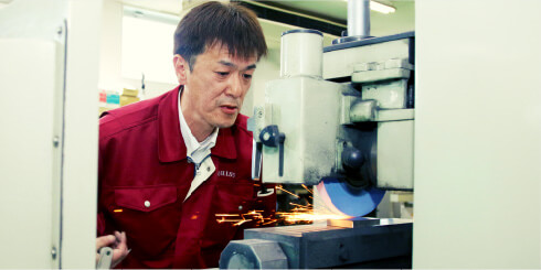 「大きいものだと、厚さ150ミリの鋼材を直径800ミリの円筒形に切り抜いたことがあります。逆のケースは厚さ100分の1ミリの金属板を0.3ミリ四方の正方形に。形状としては角より円弧が難しいです」と話すのは、3台の放電加工機を同時進行で操作する大井淳。「放電加工は、多くがマシニング加工を短縮化するための工程。スタートにポジションするので緊張感があります」。